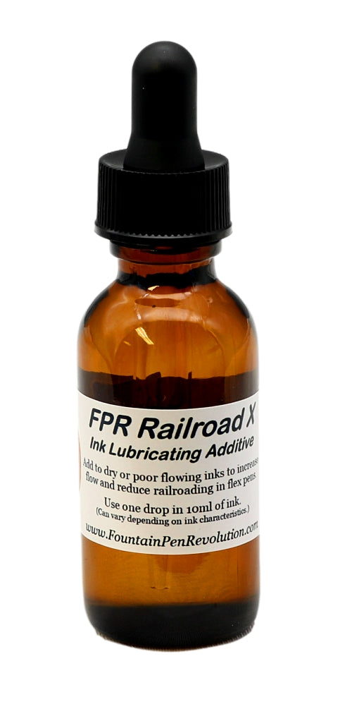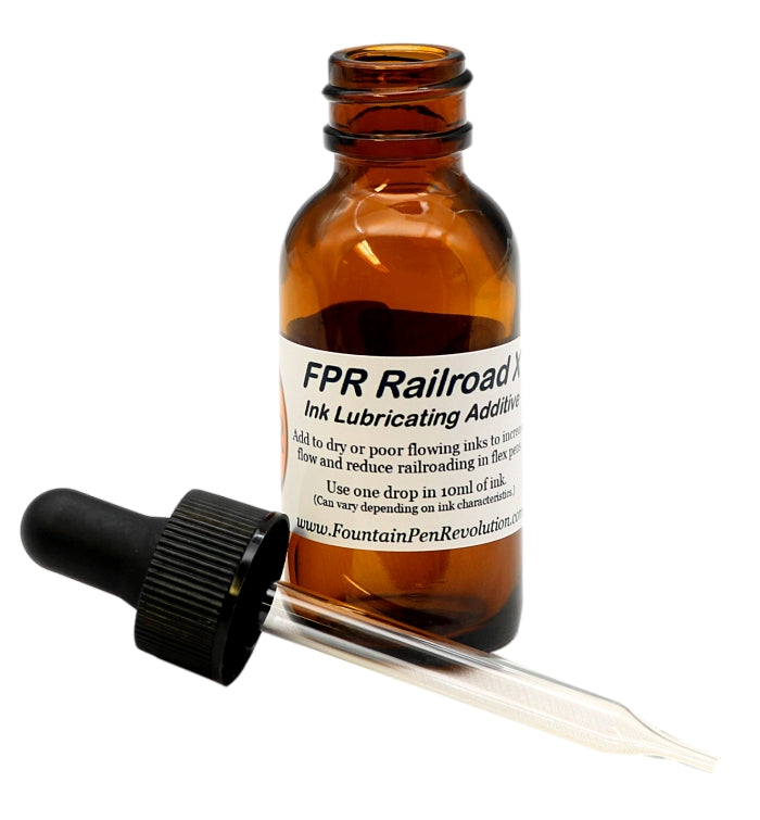 FPR Railroad X Ink Lubricating Additive is specially designed to lubricate dry and poor flowing fountain pen inks in order to increase flow and reduce railroading in flex pens. For best results use 1 drop in approximately 10ml of ink.