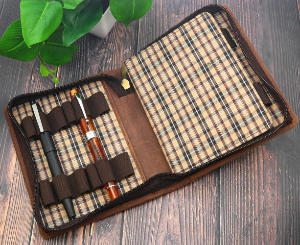 Holding up to 12 pens and and featuring a zipper closure, the Girologio 12 pen case is the way to go for serious pen carrying! It has an interior divider to protect your pens from rubbing together and is made of genuine leather. These cases are both beautiful and durable.