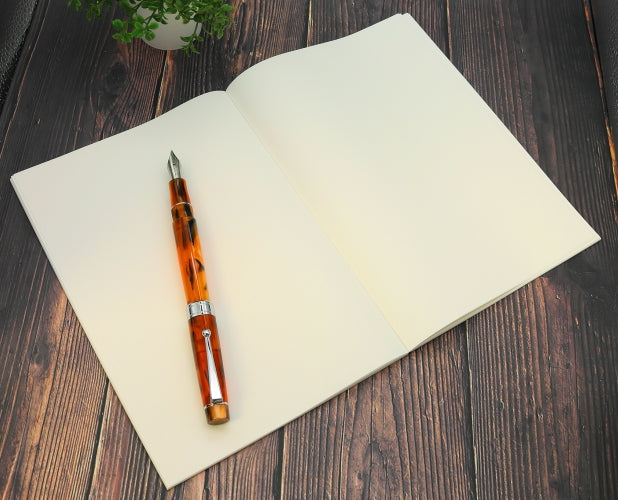 A 160 page soft bound notebook with blank pages. Tomoe River paper is made in Japan and is some most fountain pen friendly paper available on the planet. The sheets are resistant to bleed-through and feathering, can handle a variety of inks, and are acid-free. Plus, at only 52gsm, it is amazingly thin. The pages are A5 sized (5.75" x 8.25")