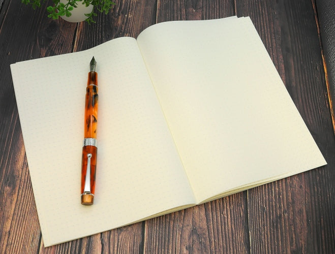 A 160 page soft bound notebook with dot grid pages. Tomoe River paper is made in Japan and is some most fountain pen friendly paper available on the planet. The sheets are resistant to bleed-through and feathering, can handle a variety of inks, and are acid-free. Plus, at only 52gsm, it is amazingly thin. The pages are A5 sized (5.75" x 8.25")