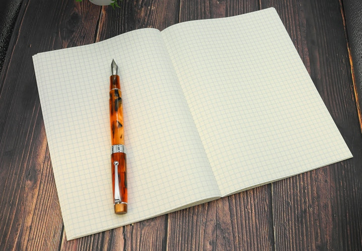 A 160 page soft bound notebook with graph pages. Tomoe River paper is made in Japan and is some most fountain pen friendly paper available on the planet. The sheets are resistant to bleed-through and feathering, can handle a variety of inks, and are acid-free. Plus, at only 52gsm, it is amazingly thin. The pages are A5 sized (5.75" x 8.25")