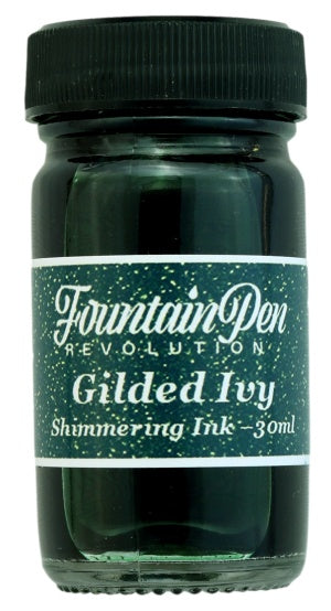 Gilded Ivy Shimmering Ink is a dark green ink with gold sparkles. It comes in an attractive glass 30ml bottle. All FPR ink is made in the USA and is safe to use in all FPR pens.