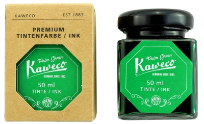 Kaweco Palm Green fountain pen ink. Kaweco fountain pen ink is safe to use in any of the fountain pens we sell. Available in 50ml glass bottles or 1.8ml samples.