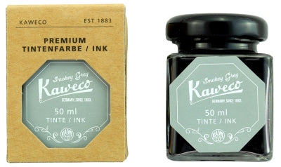 Kaweco Smokey Grey fountain pen ink. Kaweco fountain pen ink is safe to use in any of the fountain pens we sell. Available in 50ml glass bottles or 1.8ml samples.