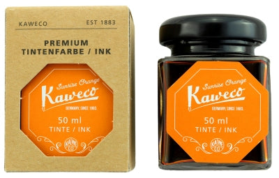 Kaweco Sunrise Orange fountain pen ink. Kaweco fountain pen ink is safe to use in any of the fountain pens we sell. Available in 50ml glass bottles or 1.8ml samples.