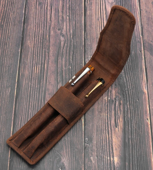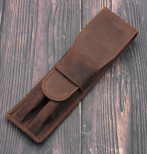 Girologio 2 Pen Case is all leather and made to carry two pens in individual pouches for maximum protection. It closes with a fold over flap.