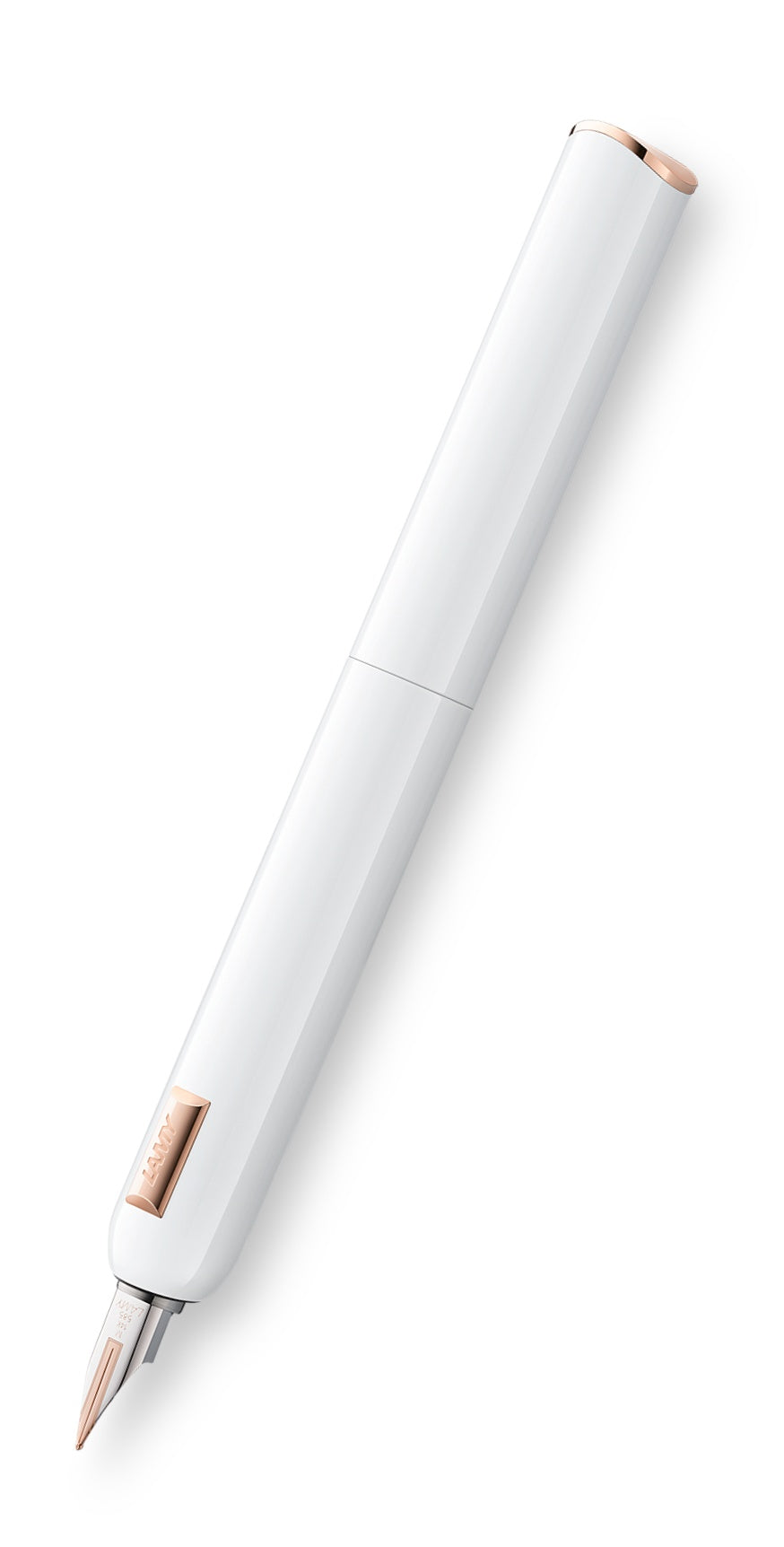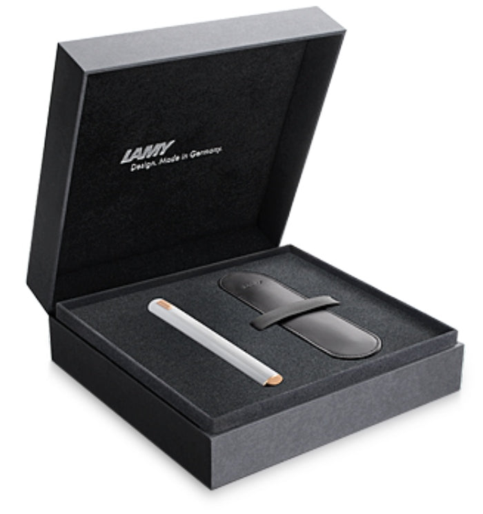 The LAMY Dialog CC has a twist mechanism that smoothly extends the nib out of the interior of the barrel.  The twist-action fountain pen is then ready to write. When closed, a ball valve automatically moves in front of the opening and protects the retracted nib from drying out and getting dirty.  It comes with an interchangeable two-tone 14K rose gold nib, a blue LAMY ink cartridge, and a proprietary Z27 converter to get you started writing right away. It come packages in an attractive gift box along with a leather pen sleeve built to hold the Dialog CC.